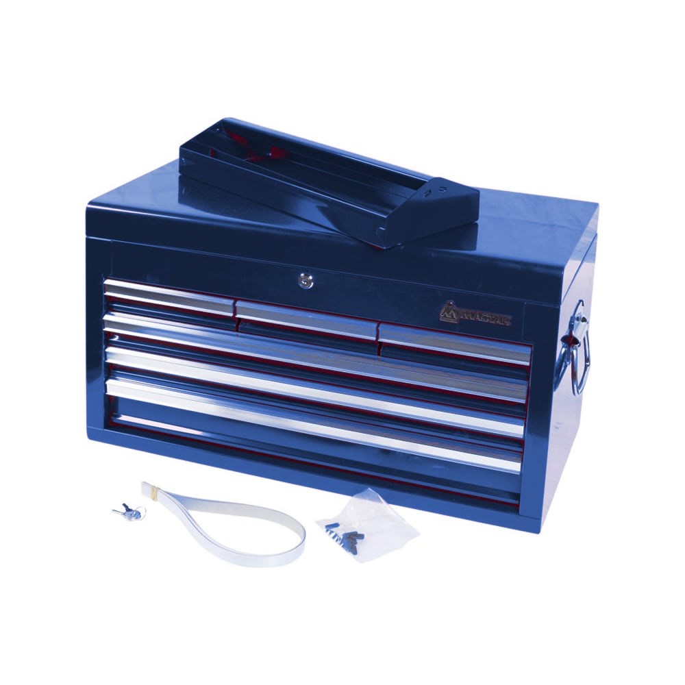Инструментальный ящик с 6 полками МАСТАК синий 511-06570B предназначен для хранения и переноски ручного инструмента. 6 выдвижных полок обеспечивают организацию инструмента таким образом, чтобы необходимый предмет всегда был под рукой. Для увеличения срока эксплуатации ящик выполнен из стали. Предусмотрен переносной стальной лоток для хранения крепежа. Центральный замок гарантирует сохранность инструмента.