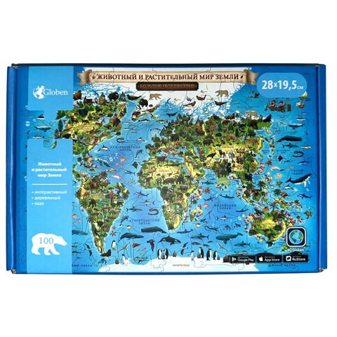 Интерактивная деревянная карта-пазл GLOBEN "Животный и растительный мир Земли", 28х19,5 см, 100 элементов, PAG5199