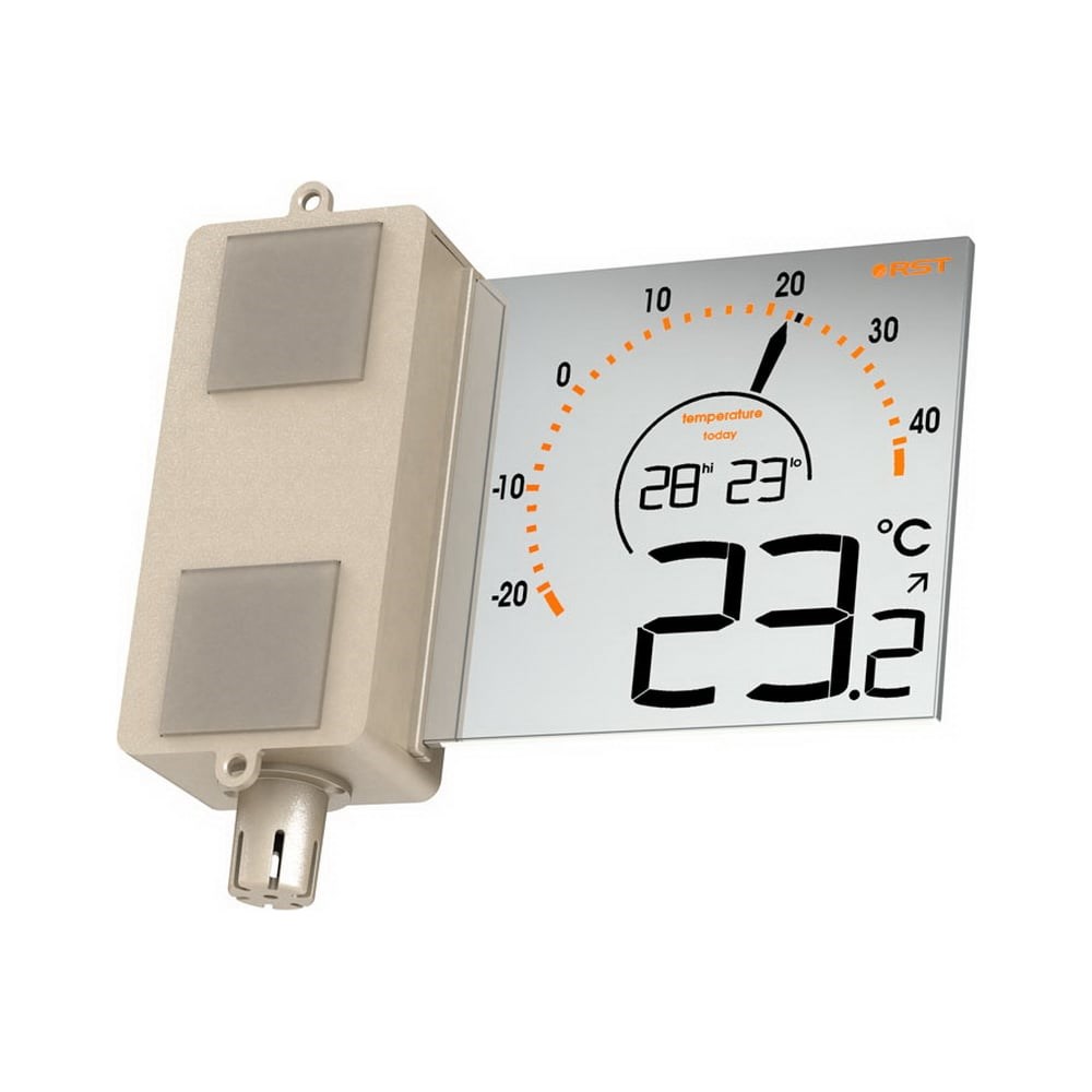 В дневное время LCD-дисплей цифрового термометра пропускает солнечный свет сквозь цифровые элементы, делая их видимыми инверсивно в белом цвете. В ночное время LCD-дисплей отражает комнатный свет и отображает цифровые элементы в черном цвете. Это позволяет в любое время суток четко видеть изображение термометра, который крепится за окном на раму (или стекло) при помощи усиленного встроенного скотча.Оконный термометр RST01091 кроме численных показаний температуры имеет на дисплее круговую классическую шкалу со стрелкой, имитирующую циферблат механического термометра с округленными значениями температуры.