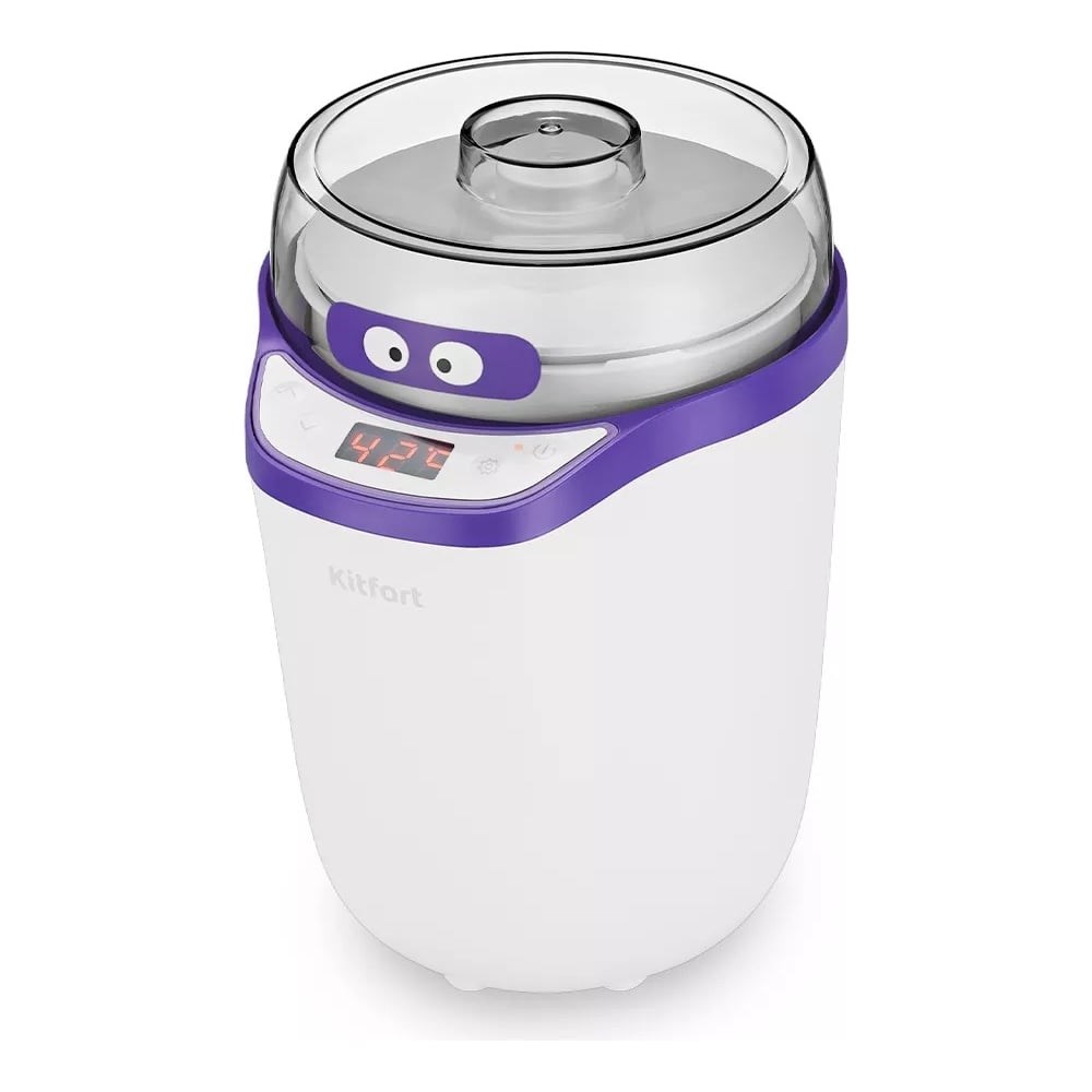 Йогуртница KITFORT бело-фиолетовая КТ-2077-1 бело-фиолетовая предназначена для приготовления вкусного и полезного домашнего йогурта. Смешайте молоко и закваску в контейнере, установите контейнер в йогуртницу, выберете подходящую программу или выставьте время и t, затем нажмите кнопку включения. Йогуртница равномерно нагревает контейнер с ингредиентами, поддерживая заданную температуру, и автоматически отключает нагрев по истечении заданного времени. Йогуртница имеет 6 предустановленных программ и одну программу с возможностью установки времени приготовления с шагом 1 час в диапазоне 1-99 часов и температуры с шагом 1°С в диапазоне 25-65 °С. Прибор укомплектован 2 контейнерами на 1,8 ли 1,6 л с крышкой, в которых йогурт можно хранить в холодильнике. В комплекте также есть сито для приготовления греческого йогурта, творога или сыра. Все части легко разбираются, моются и компактно хранятся.