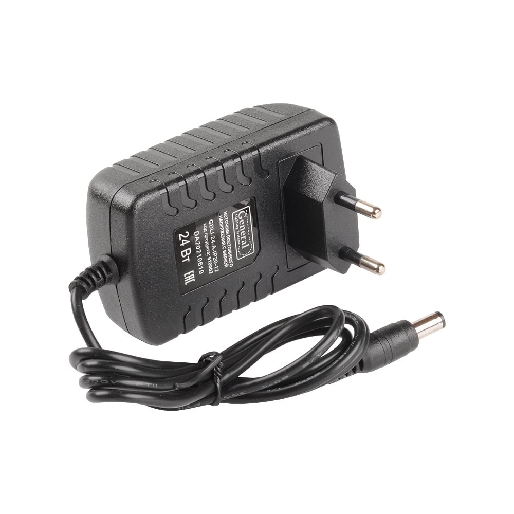 Источник постоянного напряжения с вилкой TM General представляет собой адаптер и предназначен для подключения ленты к сети 220В посредством коннекторов.