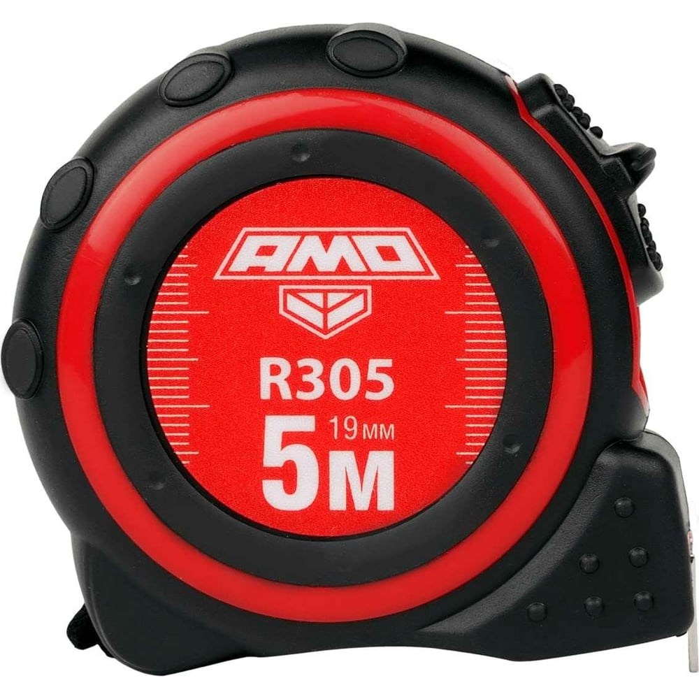 Измерительная рулетка AMO R305 851513 отличается долговечностью и предлагает пользователю привычный, безотказный функционал. Модель отличается надежной схемой крепления зацепа к ленте. Пятиметровая строительная рулетка относится ко второму классу точности, погрешность измерений незначительна для большинства видом строительных и столярных работ. На широкую (19 мм) ленту нанесены крупные, легко различимые на расстоянии цифры. Корпус инструмента выполнен из прочного пластика и усилен резиновым покрытием, которое гасит энергию удара в момент падения. Резина с рельефными вставками обеспечивает крепкий хват и значительно снижает вероятность выскальзывания. Измерительная рулетка позволяет надежно зафиксировать полотно в любой момент измерений. За эту функцию отвечает кнопка особой формы, которой удобно пользоваться даже в толстых строительных перчатках. Блокировка срабатывает четко и понятно. Металлическая клипса на задней стороне и ремешок предоставляют множество вариантов крепления инструмента как при выполнении замеров на ходу, в полевых условиях, так и при его хранении на стеллаже в мастерской или гараже.