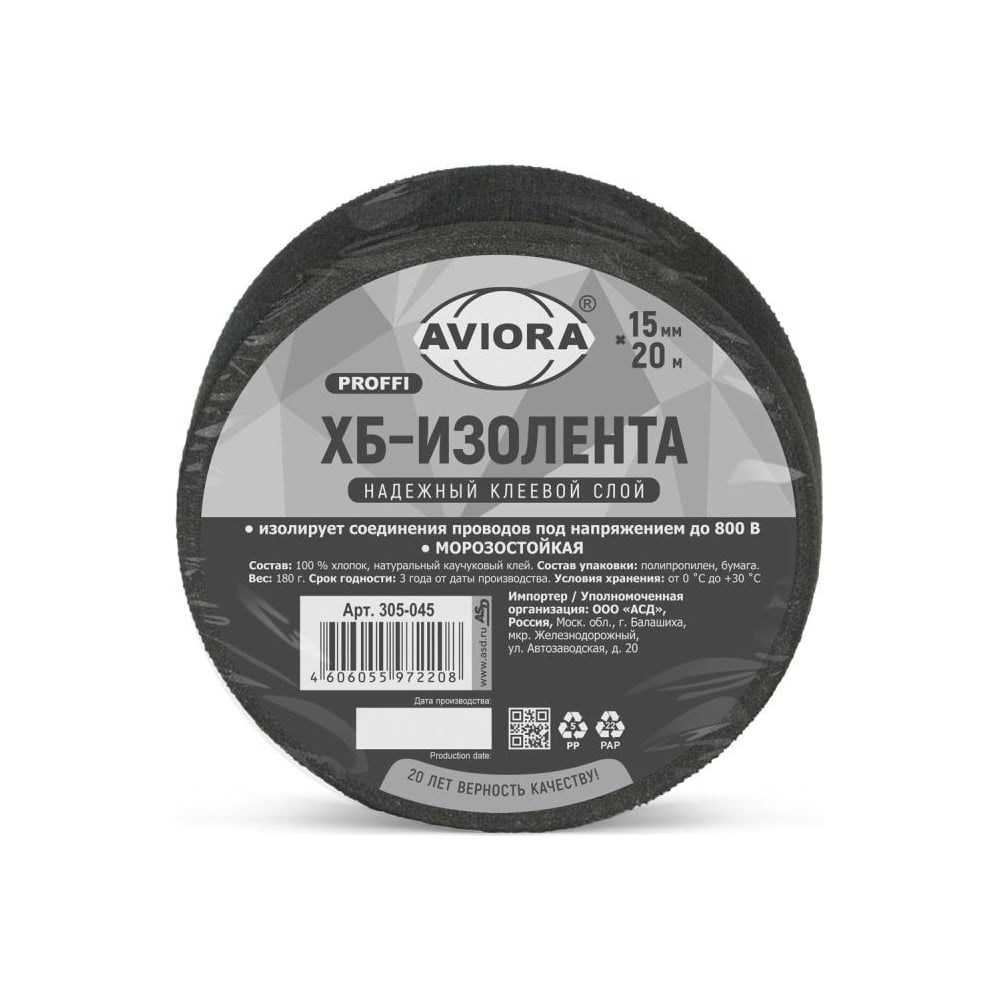 Изолента хлопчатобумажная предназначена для электрической изоляции проводов. Тканевая изолента AVIORA - это усовершенствованный вид старой доброй ХБ изоленты. Изолента тканевая имеет ровную структуру тканевой основы и качественный слой клея из натурального каучука, который полностью пропитывает ленту. Изолента ХБ имеет высокую и надежную адгезию (клейкость) к изолируемым проводам и к самой себе. Помимо изоляции черная изолента на тканевой основе широко используется в быту в качестве спортивной ленты, например, для обмотки клюшек или рукояток инструмента. Хлопчатобумажная изолента также используется при ремонте автомобиля для обмотки проводки или датчиков. ХБ изолента хорошо растягивается, а значит более плотно ложится на обматываемую поверхность. Основным преимуществом хлопчатобумажной изоленты является ее морозостойкость, т.к. ее можно наносить при умеренных низких температурах (не ниже -10°C). Благодаря легкому весу тканевой изоленты ее удобно наматывать. Зимой не дубеет, летом не расползается от повышенной температуры.