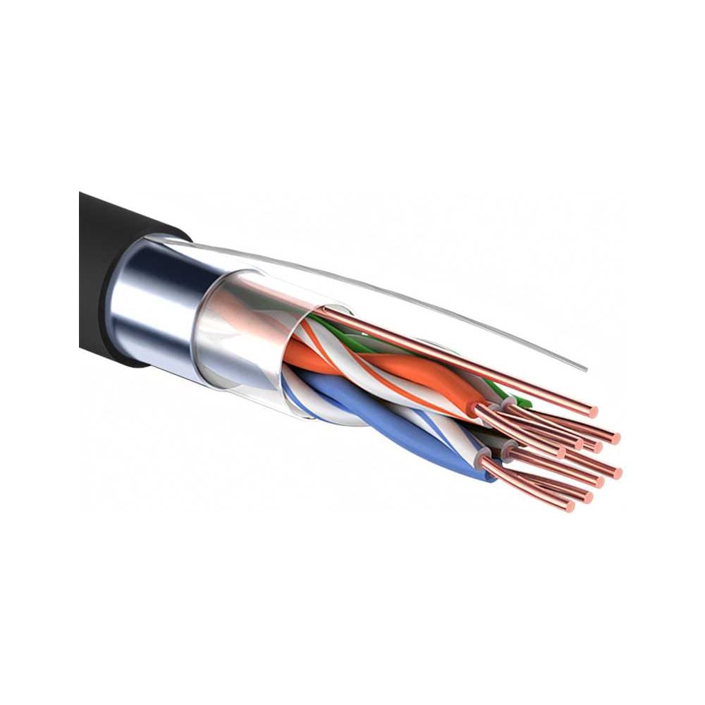 Кабель витая пара F/UTP черного цвета PROconnect предназначен для создания локальных сетей общего назначения, домашних сетей, сетей малого бизнеса, компьютерных сетей, сетей передачи данных, узкоспециализированных сетей. Применяется для подключения устройств охранной системы, телефонии, интернета, цифрового телевидения и т.д. Служит для прокладки вне зданий. Относится к категории 5е – рассчитан на рабочие частоты до 100 МГц. Проводник кабеля изготовлен из высокоочищенной бескислородной меди и покрыт изоляцией из полиэтилена повышенной плотности (HDPE). Внешняя оболочка выполнена из полиэтилена. Экранирование из алюминиевой фольги предусматривает защиту от электромагнитных помех. Дополнительный самонесущий трос позволяет при необходимости подвесить кабель. Техническое описание: Кабель имеет 8 (восемь жил), четыре пары (4PR) Материал проводника: высокоочищенная бескислородная медь, калибр (24 AWG) Изоляция проводника: полиэтилен повышенной плотности (HDPE), диаметром 0,9 мм Экранирование, FTP: в экране (алюминиевая фольга) Внешняя изоляция: ПЭ — полиэтилен (PE), толщина 0,5 мм Общий диаметр кабеля: 6,2 мм Радиус изгиба кабеля минимально выдерживает 8 (восемь) внешних диаметров кабеля Частотный диапазон: 1-100 МГц Рабочая температура: –60...+60 °C, прокладка и монтаж кабелей должны производиться при температуре не ниже –10 °С Упаковка: бухта 305 м/в коробке одна бухта Срок службы: 15 лет