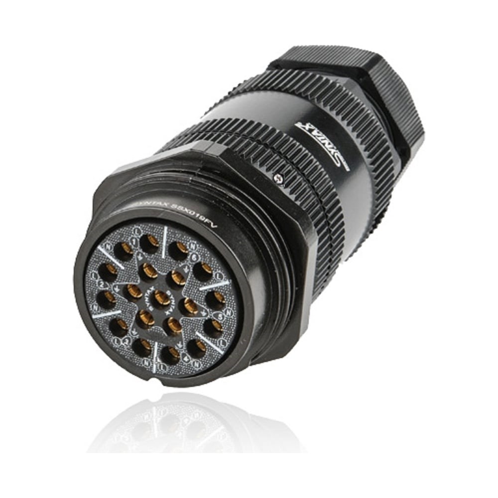 Кабельные и встраиваемые разъемы SYNTAX SSX, разработаны для профессионального подключения силовой аппаратуры и осветительного оборудования к источникам питания. Продукция чрезвычайно прочна и изготовлена из толстостенного алюминиевого сплава с износостойким анодированным черным покрытием. Термопластичная изоляционная вставка позволяет использовать съемные контакты для удобства пайки. Устройство полностью IP67 водонепроницаемо при соединении. Электробезопасность и соответствие гарантируется внутренней изоляцией оболочек, полученной через безопасную изолирующую втулку, предотвращающую поражение электрическим током. Кольца заземления допускают замыкание контактов заземления. Каждый контакт может нести нагрузку 23A при постоянном подключении. Сечение многожильного провода для пайки 0,25-4 кв.мм.