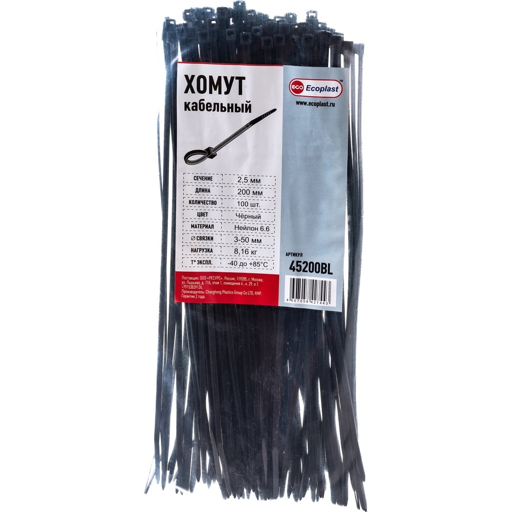 Кабельные хомуты Экопласт 2,5 х 200 мм, цвет черный, 100 шт 45200BL
