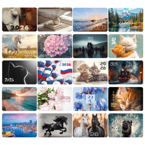 Ассорти календарей (20 видов) с разными современными дизайнами. Размер – 64х93 мм. Сделаны из картона 190г/м2, скругленные уголки, заливка УФ-лаком на постере. Календарная сетка на 2026 год в 2 краски.