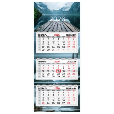 Календарь квартальный 2026 г., 3 блока, 3 гребня, бегунок, мелованная бумага, BRAUBERG PREMIUM, "Озеро", 116829