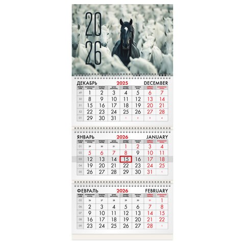 Календарь квартальный на 2026 г., 3 блока, 3 гребня, бегунок, мелованная бумага, BRAUBERG, "Лошадь", 116791