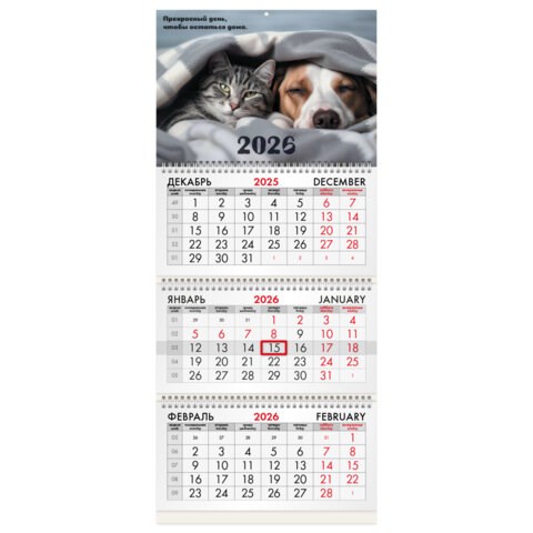 Календарь квартальный на 2026 г., 3 блока, 3 гребня, бегунок, офсет, BRAUBERG, "Домашние любимцы", 116763