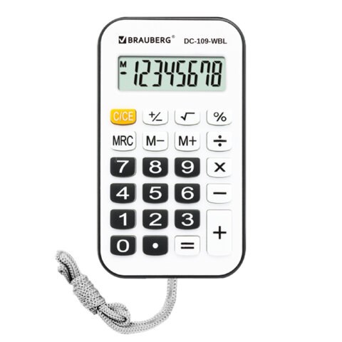Калькулятор карманный со шнурком BRAUBERG DC-109-WBL (61x110 мм), 8 разрядов, БЕЛЫЙ/ЧЕРНЫЙ, 272643