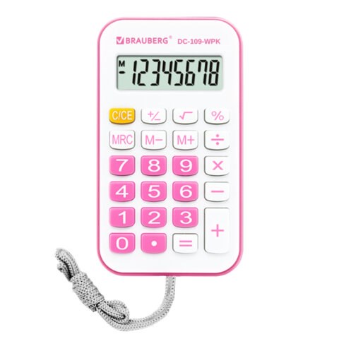 Калькулятор карманный со шнурком BRAUBERG DC-109-WPK (61x110 мм), 8 разрядов, БЕЛЫЙ/РОЗОВЫЙ, 272646