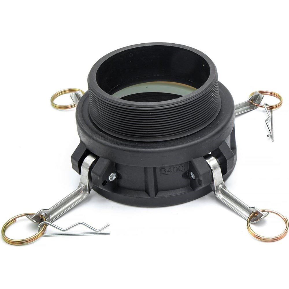 В: тип камлока - муфта с наружней резьбой и приёмной частью "мама" с фиксаторами кулачкового типа 400: условное обозначение диаметра камлока 4": внутренний диаметр трубы (условный проход трубы), обозначение размера резьбы в дюймах. Соответствует 100 мм. Вид резьбы: дюймовая трубная коническая R (BSPT) Материал уплотнения для стороны с приёмной частью "мама": кольцо прямоугольного сечения из силикона Материал корпуса: полипропилен, усиленный стекловолокном 25%. Устойчив к кислотам, щелочам, органическим соединениям, нефтепродуктам. Имеет превосходную механическую прочность, низкую температуру плавления и гладкую поверхность с высоким коэффициентом скольжения Материал кулачков: нержавеющая сталь или бронза Номинальное рабочее давление: 6 бар Рабочая температура уплотнения: от -35°C до +200°C Рабочая температура камлока: от -10°C до +65°C