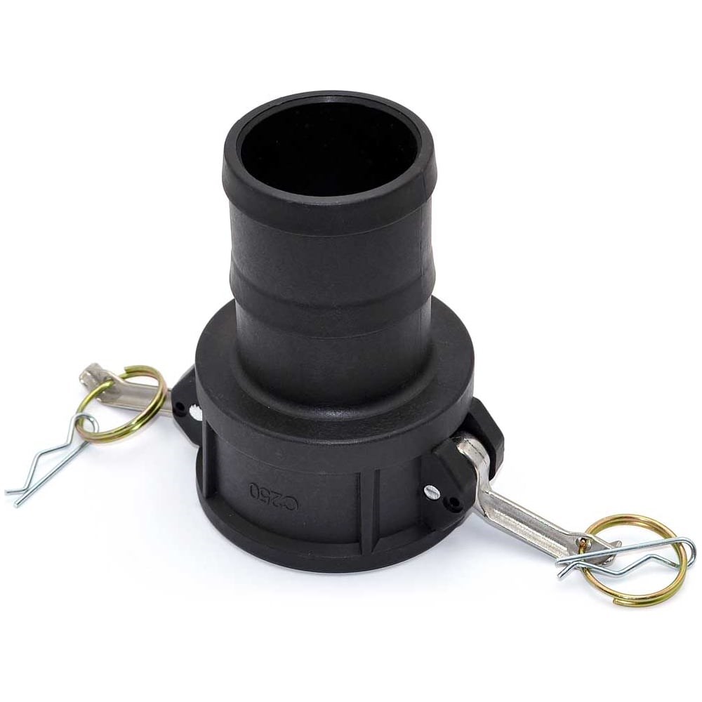 С: тип камлока - муфта со штуцером типа "ёлочка" и приёмной частью "мама" с фиксаторами кулачкового типа 250: условное обозначение диаметра камлока 2 1/2": внутренний диаметр трубы (условный проход трубы). Соответствует 63 мм. Материал уплотнения для стороны с приёмной частью "мама": кольцо прямоугольного сечения из силикона Материал корпуса: полипропилен, усиленный стекловолокном 25%. Устойчив к кислотам, щелочам, органическим соединениям, нефтепродуктам. Имеет превосходную механическую прочность, низкую температуру плавления и гладкую поверхность с высоким коэффициентом скольжения Материал кулачков: нержавеющая сталь или бронза Номинальное рабочее давление: 6 бар Рабочая температура уплотнения: от -35°C до +200°C Рабочая температура камлока: от -10°C до +65°C
