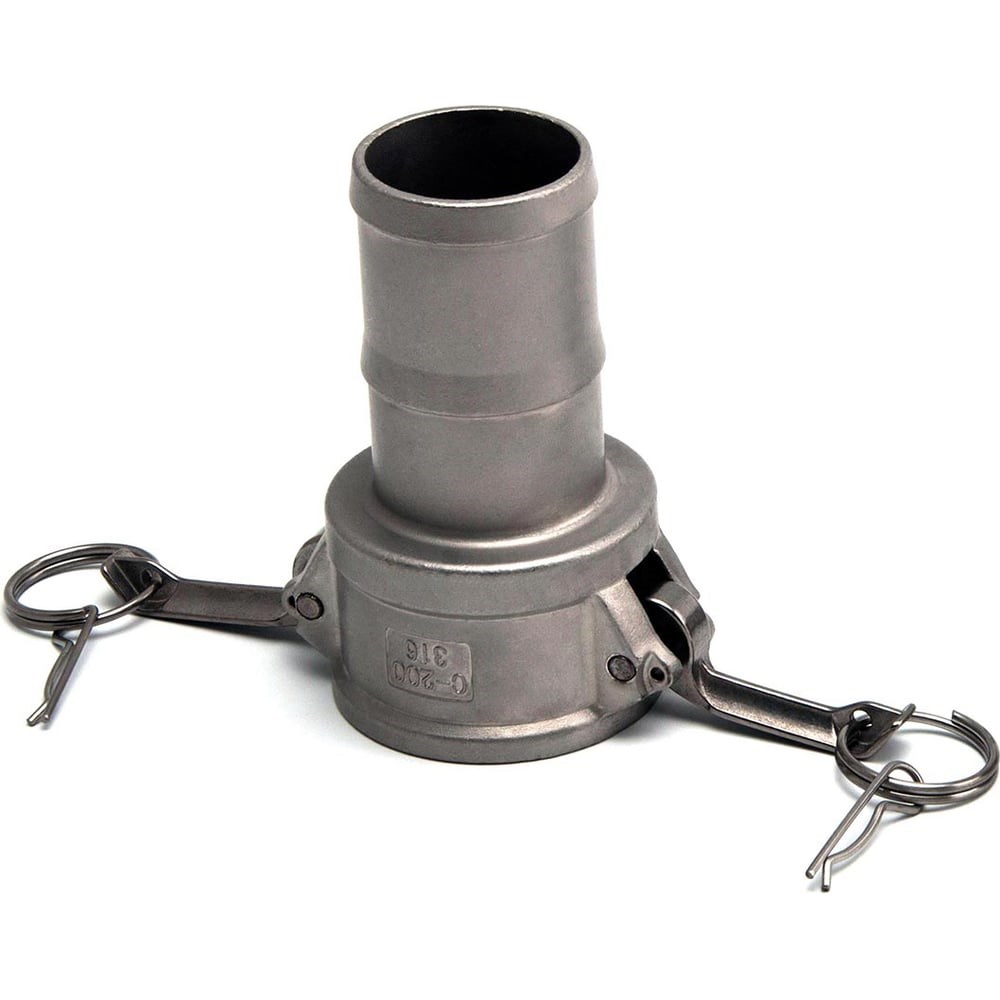 С: тип камлока - муфта со штуцером типа "ёлочка" и приёмной частью "мама" с фиксаторами кулачкового типа 200: условное обозначение диаметра камлока 2": внутренний диаметр трубы (условный проход трубы). Соответствует 50 мм. Материал уплотнения для стороны с приёмной частью "мама": кольцо прямоугольного сечения из силикона Материал корпуса: нержавеющая сталь AISI 316 - это сталь AISI 304, улучшенная путём добавления молибдена и никеля. Благодаря молибдену данная сталь немагнитна, особенно устойчива к коррозии, высоким температурам и агрессивным средам (серная, фосфорная, борная, муравьиная, уксусная, щавелевая, молочная и прочие кислоты) Материал кулачков: нержавеющая сталь Номинальное рабочее давление: 20 бар Рабочая температура уплотнения: от -60°C до +200°C Рабочая температура камлока: от -65°C до +260°C