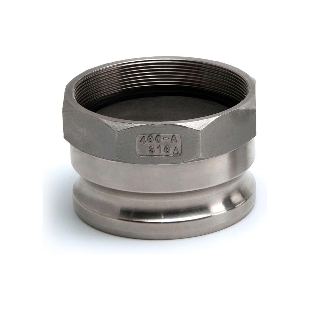 А: тип камлока - соединительный штуцер с внутренней резьбой и ответной частью "папа" 400: условное обозначение диаметра камлока 4": внутренний диаметр трубы (условный проход трубы), обозначение размера резьбы в дюймах. Соответствует 100 мм. Вид резьбы: дюймовая трубная цилиндрическая G (BSPP) Материал корпуса: нержавеющая сталь AISI 316 - это сталь AISI 304, улучшенная путём добавления молибдена и никеля. Благодаря молибдену данная сталь немагнитна, особенно устойчива к коррозии, высоким температурам и агрессивным средам (серная, фосфорная, борная, муравьиная, уксусная, щавелевая, молочная и прочие кислоты) Номинальное рабочее давление: 10 бар Рабочая температура камлока: от -65°C до +260°C