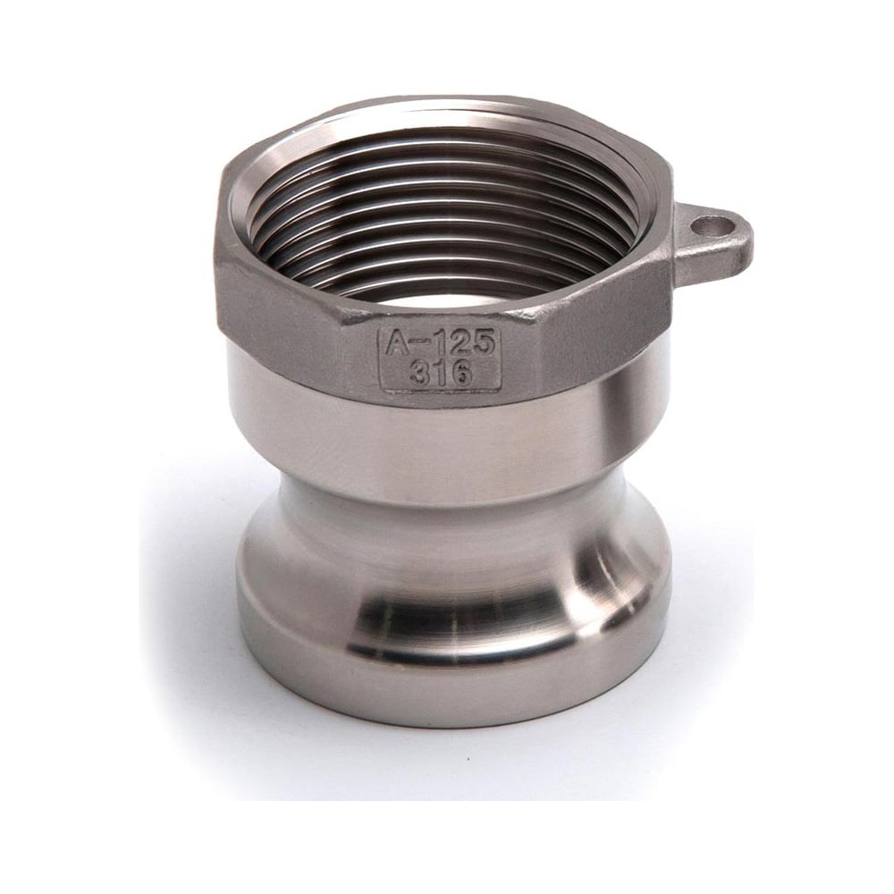 А: тип камлока - соединительный штуцер с внутренней резьбой и ответной частью "папа" 125: условное обозначение диаметра камлока 1 1/4": внутренний диаметр трубы (условный проход трубы), обозначение размера резьбы в дюймах. Соответствует 32 мм. Вид резьбы: дюймовая трубная цилиндрическая G (BSPP) Материал корпуса: нержавеющая сталь AISI 316 - это сталь AISI 304, улучшенная путём добавления молибдена и никеля. Благодаря молибдену данная сталь немагнитна, особенно устойчива к коррозии, высоким температурам и агрессивным средам (серная, фосфорная, борная, муравьиная, уксусная, щавелевая, молочная и прочие кислоты) Номинальное рабочее давление: 20 бар Рабочая температура камлока: от -65°C до +260°C