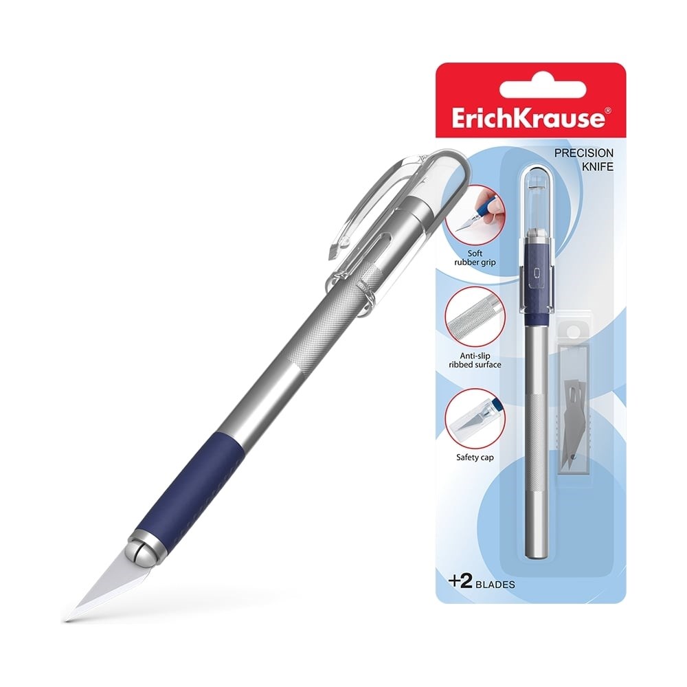 Нож-скальпель канцелярский для аккуратной и точной работы по бумаге. Полностью металлический корпус с резиновой зоной захвата и защитным колпачком. Комплектуется износостойким стальным лезвием с двухсторонней заточкой. Не ржавеет. Два запасных стальных лезвия в наборе.