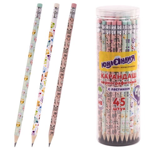 Каждый карандаш имеет индивидуальный штрих-код. Легко затачивается, максимально устойчив к повреждениям. Изготовлен из дерева высокого качества. Имеет круглый корпус с яркой печатью ассорти, оснащен ластиком. Карандаш длиной 190 мм обладает средней степенью твердости – HB. Поставляется заточенным в пластиковой тубе по 45 штук.