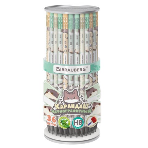 Карандаш чернографитный с принтом кросс-серия МИЛЫЕ КОТЫ, 1 шт., HB, ластик, ассорти, BRAUBERG, 182107