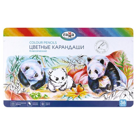 Карандаши цветные ГАММА "Классические", 36 цветов, металлический пенал, шестигранные, грифель 3,3 мм, натуральное дерево, 80220215