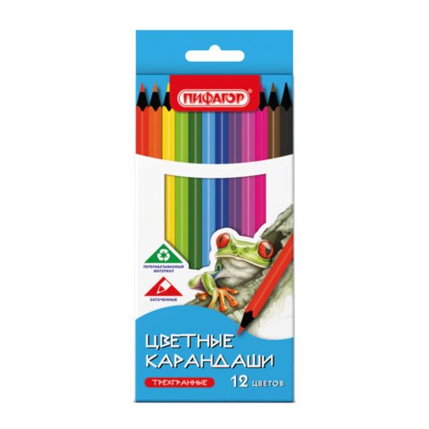 Карандаши цветные ПИФАГОР СТАНДАРТ 12 цветов, трехгранный корпус, 182087