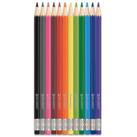 Карандаши цветные стираемые с ластиком BRAUBERG, 12 цветов, шестигранные, 182070