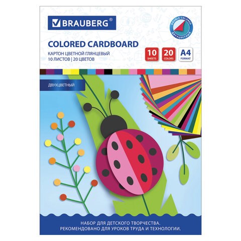 Двусторонний целлюлозный мелованный картон BRAUBERG с улучшенной прокраской обладает плотностью 200 г/м2, имеет глянцевую поверхность с одной стороны и матовую с другой, благодаря чему сохраняет четкость, яркость и насыщенность оттенка на протяжении длительного времени. Картон легко режется ножницами, сгибается и клеится. Двухцветный внутренний блок состоит из 10 листов формата А4 и 20 цветов. Картон вложен в красочную картонную папку, которая имеет дополнительный нижний клапан, благодаря чему листы не выпадут и не помнутся.