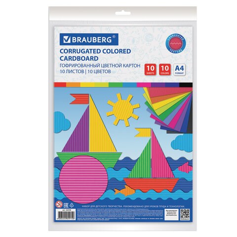 Картон цветной А4 ГОФРИРОВАННЫЙ, 10 листов 10 цветов, 180 г/м2, BRAUBERG, 124749