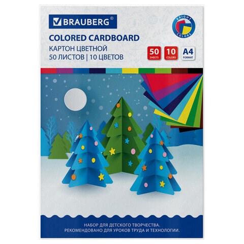 Картон цветной А4 немелованный, 50 листов 10 цветов, склейка, BRAUBERG, 200х290 мм, 113559