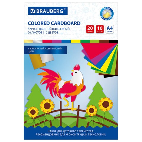 Немелованный картон BRAUBERG с улучшенной прокраской обладает плотностью 200 г/м2, имеет матовую поверхность. Картон легко режется ножницами, сгибается и клеится. Внутренний блок состоит из 20 листов формата А4 и 10 цветов (содержит золотой и серебряный цвет). Картон вложен в красочную картонную папку, на обороте которой есть творческая инструкция для создания поделки.