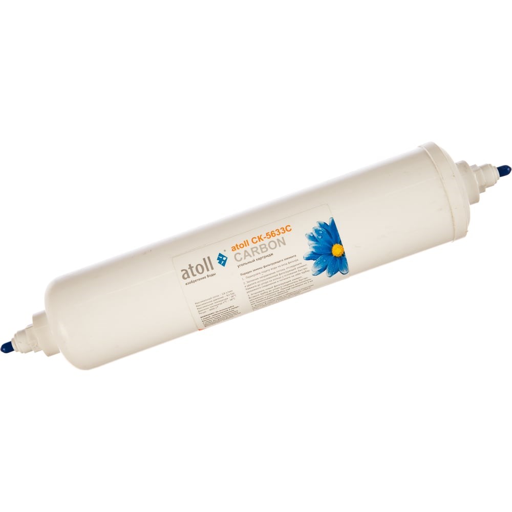 Угольный inline картридж atoll CK-5633C (2,5"x12"-1/4") с быстросъемными соединениями 1/4" дюйма, применяется в качестве префильтра в системах обратного осмоса серий Compact и Sailboat. Удаляет хлор, органические соединения, привкус, запах воды.Фильтрующий материал: активированный уголь.Рекомендуемая периодичность замены: 6 месяцев.