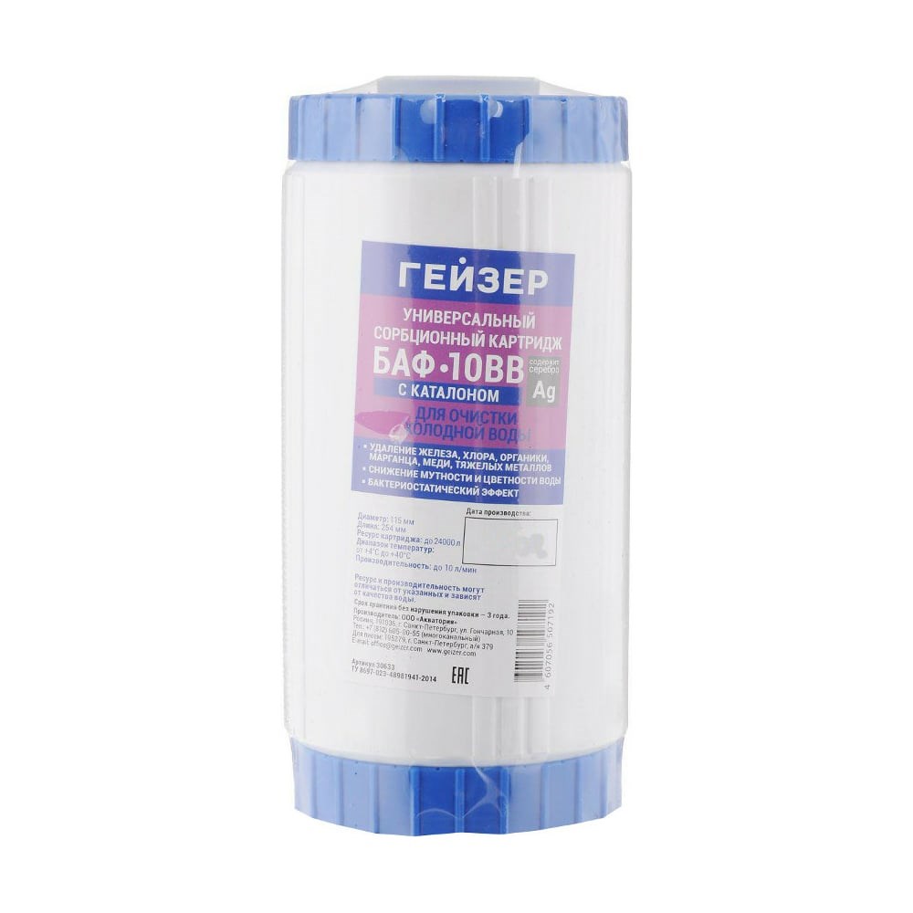 Гейзер БАФ - BB10 - картридж с мультикомпонентной загрузкой из ионообменных материалов и сорбентов для очистки воды от остаточного хлора, органических соединений, железа (при содержании до 2 мг/л) и других вредных примесей.Предназначен для очистки питьевой воды и может быть использован как одноступенчатый фильтр, так и в составе тройки на 2-ой и 3 –й ступени. Основное предназначение очистка воды от остаточного хлора, органических соединений и железа при содержании до 2 мг/л.Состав картриджа:Смесь гранулированного серебренного активированного угля, волокнистого углеродного сорбента (ММВ) и ионообменного волокна Каталон с внедренными в его структуру ионами серебра и микрочастицами угля.Эффективно удаляет:твердые частицы, хлор, хлорорганические соединения, бензол, фенол, органические соединения, нефтепродукты, пестициды, железо, медь, марганец, ртуть, ионы тяжелых металлов, мутность, цветность, неприятные привкусы, запахи и др.Характеристики:Температура воды до 40°СОбщий ресурс до 35 м3Типоразмеры (высота/диаметр), ВВ 10” (Ø 114 мм)