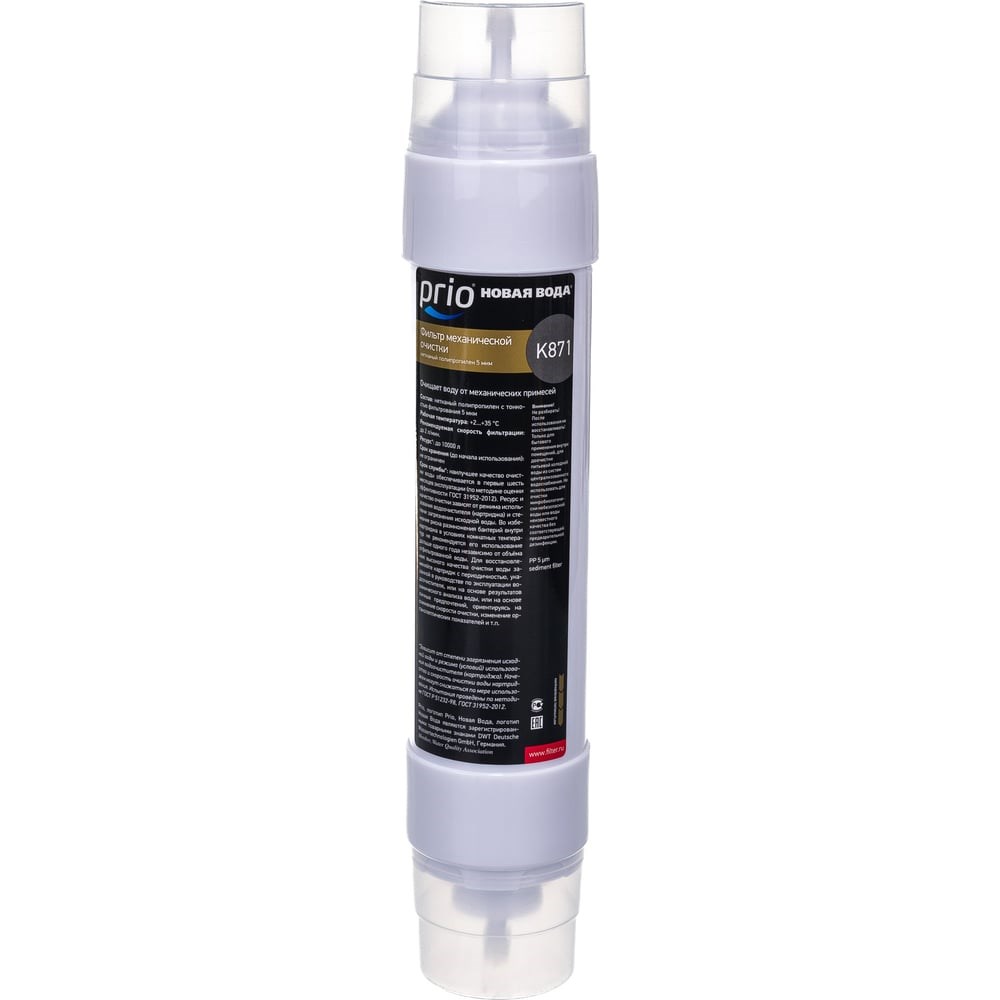 Картридж механической очистки K871 PRIO Новая Вода используется как первая ступень в очистке воды фильтров Prio Новая Вода Expert М200, М300, М310, М312 и М400. Фильтр изготовлен из нетканого полипропилена и способен очистить воду от частиц песка, ила и ржавчины более 5 мкм. Давление подводимой воды - от 0,14 до 0,80 МПа (от 1,4 до 8,0 кгс/см²); Максимальное мгновенное давление на входе (гидроудар) - 1,6 МПа (16 кгс/см²).