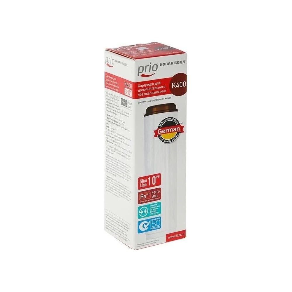 Картридж Prio Новая вода К400 используется в картриджных системах Prio Новая вода. Предназначен для удаления растворенного железа в воде (Fe2+). Картридж состоит из синтетического цеолита и гранулированного активированного угля, благодаря чему улучшается вкус воды. Дополнительные характеристики: типоразмер: SL; длина: 10"; температура очищаемой воды: 2-35 °С.