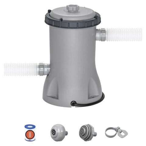 Подходит для каркасных и надувных бассейнов. Производительность насоса — 2006 литров в час. Принцип работы фильтра очень прост: вода прокачивается через отверстие по шлангу, проходит фильтрацию через специальный картридж (тип II) и возвращается обратно в бассейн уже очищенной. Замена картриджа требуется раз в две недели при непрерывной работе.