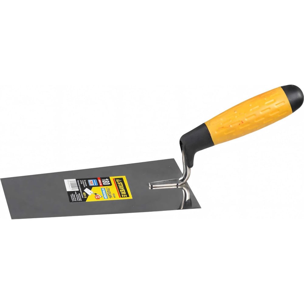 Кельма трапеция STAYER 08291-18 используется для нанесения и выравнивания растворов и смесей. Нержавеющее стальное полотно обеспечивает прочность конструкции, а двухкомпонентная ручка удобство в работе.