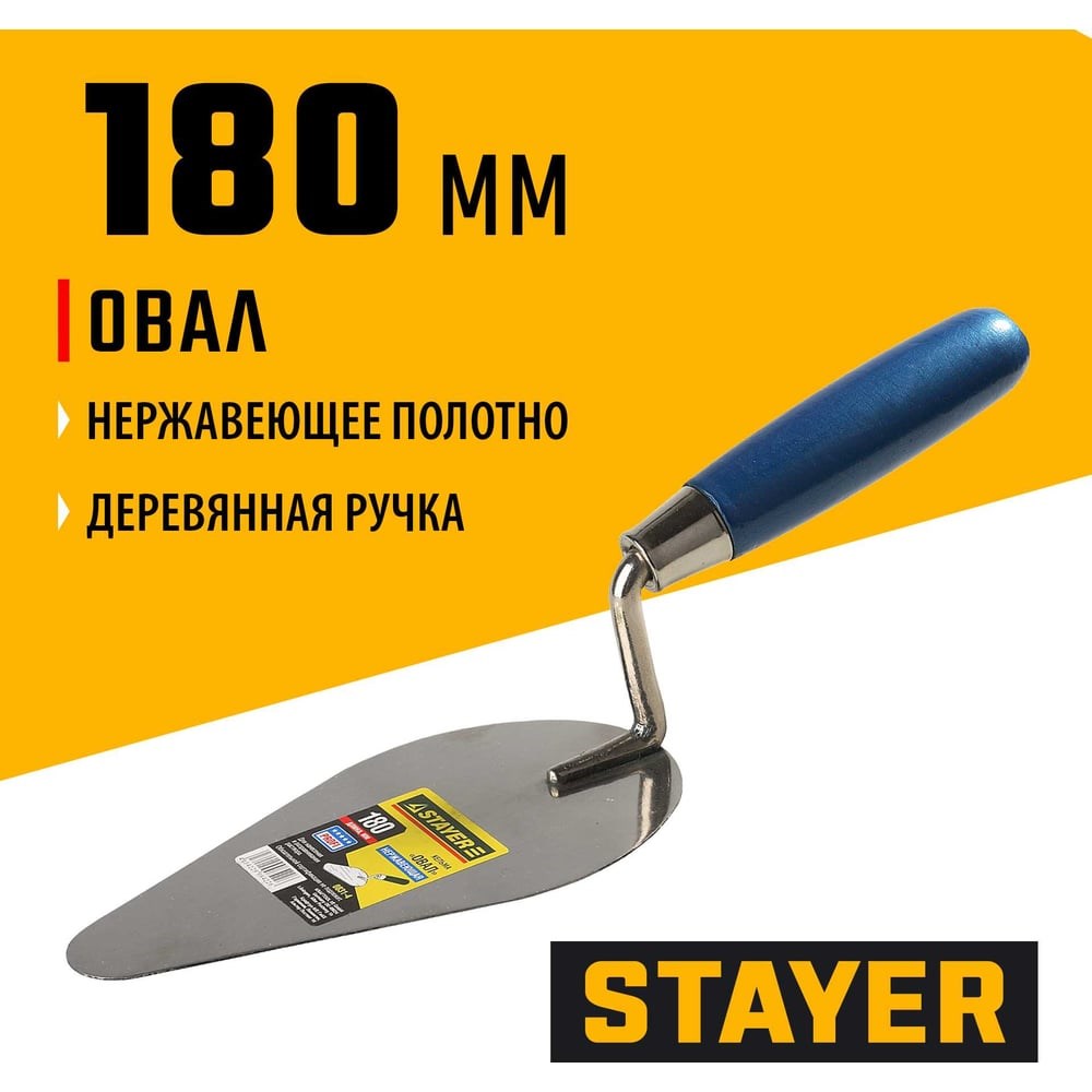 Кельма STAYER 0831-4 выполнена в форме овала, 180 мм. Такая кельма применяется для перемешивания растворов, кладки кирпича и нанесения штукатурно-отделочных материалов на обрабатываемую поверхность. Полотно кельмы изготовлено из нержавеющей стали.