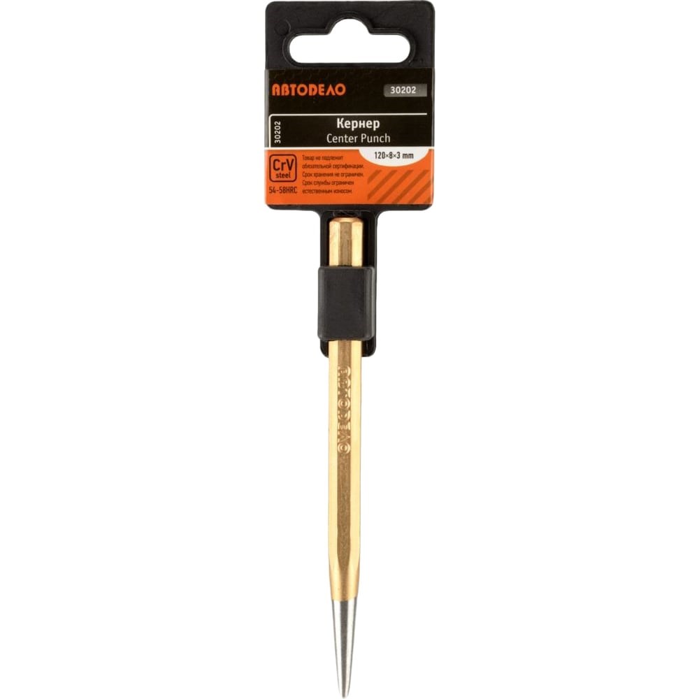 Кернер на держателе Автоdело 3х8х120 мм 30202 13252 предназначен для применения в быту, а также для ремонта различных транспортных средств. Основные характеристики: оптимален для материалов с разной степенью твердости; произведен из особо прочной инструментальной стали, устойчивой к механическим нагрузкам и износу; изготовлен способом горячей штамповки; показатель твердости — 54–58 HRC; рабочая часть имеет коническую форму. Кернер необходим для проведения общих демонтажных и долбежных работ. Чтобы удобно хранить инструмент, производитель предусмотрел прочный держатель из пластика.