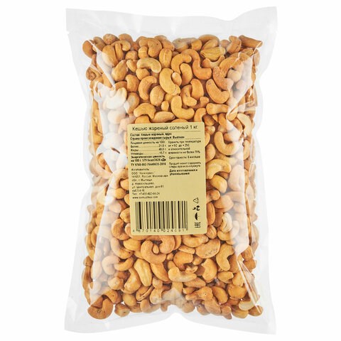 Ядра орехов кешью жареные соленые обладают натуральным вкусом и ароматом, характерным для орехов кешью. Обжариваются с добавлением масла и соли без посторонних примесей и добавок. Кешью является питательным и вкусным орехом, применяемым в кулинарии и кондитерском производстве. Его также можно использовать как полезный и вкусный перекус в течение рабочего или учебного дня!