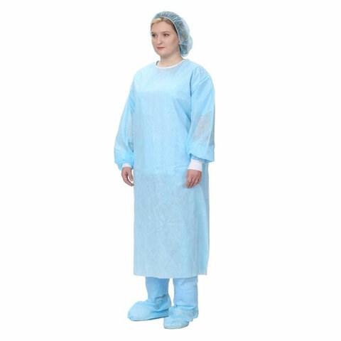 Технология производства халата – сварной шов без проколов ткани. Изготовлен из спанбонда, обладает хорошей воздухопроницаемостью. Рукава халата на мягком трикотажном манжете. Материал одежды мягкий и легко драпируется. Товар одноразового применения.