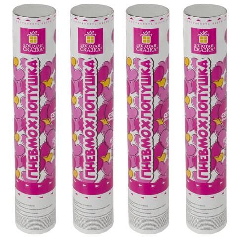 Комплект хлопушек высотой 30 см с фольгированным наполнителем в виде сердечек красного цвета является абсолютно безопасным. Выстрел осуществляется под действием сжатого воздуха. Не является пиротехникой. Средняя дальность выстрела – 5-7 м. Корпус хлопушки состоит из двух частей: пневматического баллона со сжатым воздухом и картонного цилиндра с наполнителем. Рекомендуется использовать хлопушку внутри больших помещений или на улице.