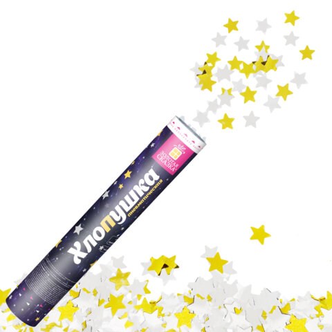 Хлопушка высотой 30 см с фольгированным наполнителем в виде звезд золотистого и серебристого цветов является абсолютно безопасной. Выстрел осуществляется под действием сжатого воздуха. Не является пиротехникой. Средняя дальность выстрела – 3-5 м. Корпус хлопушки состоит из двух частей: пневматического баллона со сжатым воздухом и картонного цилиндра с наполнителем. Рекомендуется использовать хлопушку внутри больших помещений или на улице.