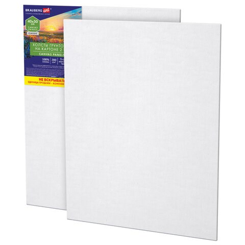 Холсты на картоне НАБОР 2 штуки (40х50 см), хлопок, грунт, 280 г/м2, BRAUBERG ART CLASSIC, 192655
