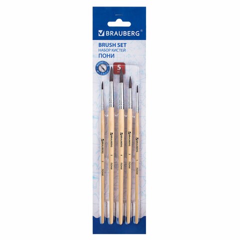 Кисти BRAUBERG, набор 5 шт. (пони, круглые № 1, 2, 3, 4, 5), блистер, 200222