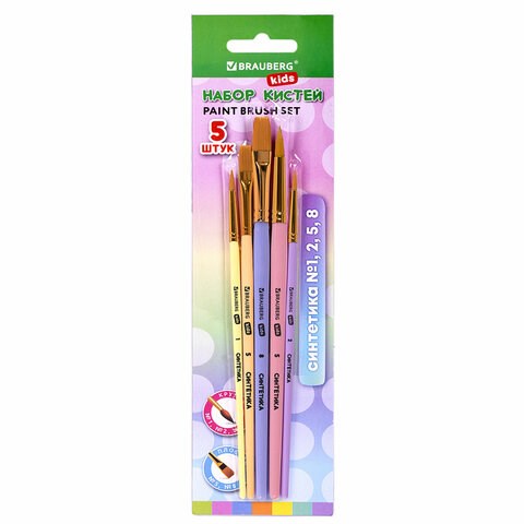 Кисти СИНТЕТИКА набор 5 шт. (круглые № 1, 2, 5, плоские № 5, 8), блистер, BRAUBERG KIDS, 201075