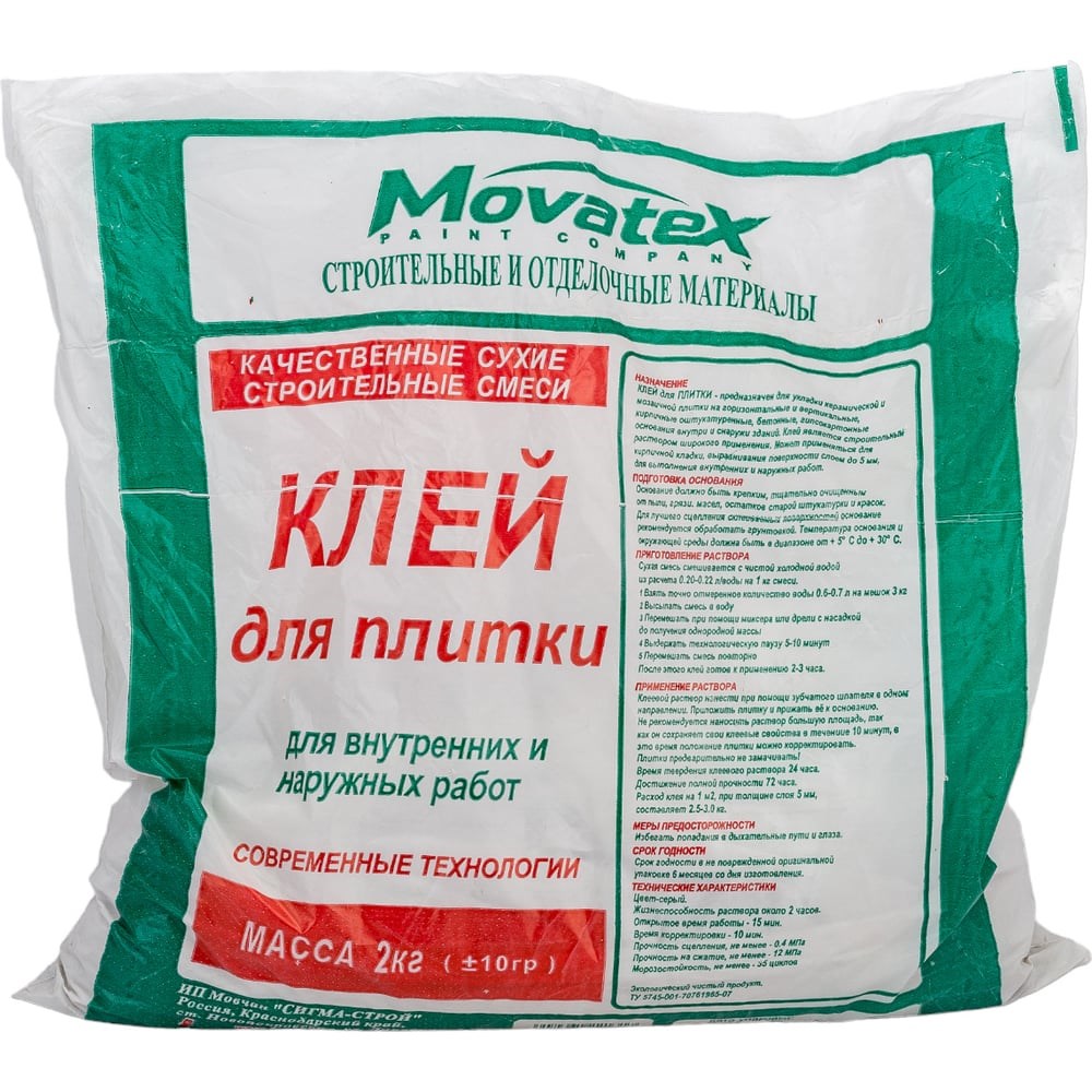 Клей для плитки Movatex 2 кг Т02373 предназначен для укладки керамической плитки внутри и снаружи помещений. Сухую строительную смесь разводят чистой водой до получения однородной массы и наносят на сухое бетонное основание. Состав обеспечивает прочное сцепление с поверхностью.