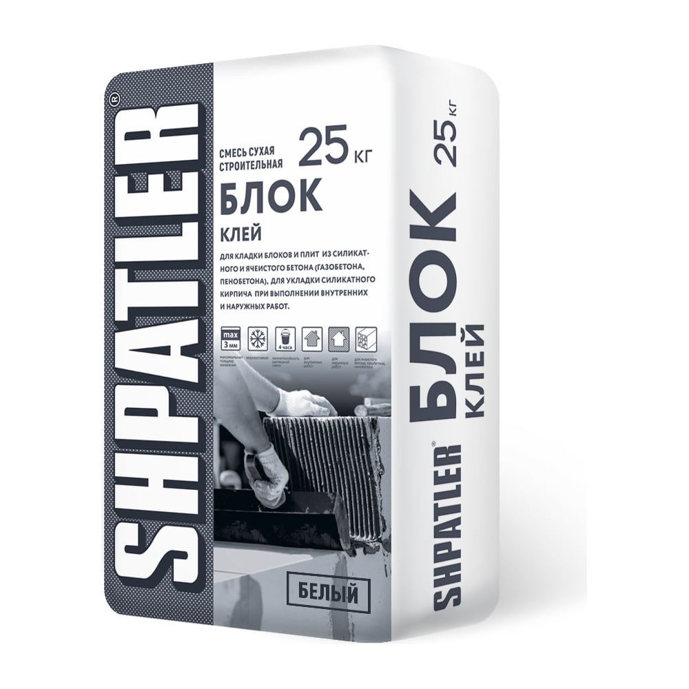 Кладочно-монтажная смесь для укладки пеноблоков применяется для возведения стен и перегородок из облегченных блоков на основе ячеистого бетона, пенобетона, газобетона, полистиролбетона, газосиликатных, силикатных и облегченных керамических блоков. Предназначен для кладки плит и блоков, при выполнении внутренних и наружных работ. Создаёт надежное, эстетическое основание, устойчивое к воздействию окружающей среды даже без внешней отделки стен. Шпатлер Блок белый -это сухая строительная смесь на основе высокопрочного белого цемента, фракционированного заполнителя и функциональных добавок. При смешивании с водой образует удобную в работе пластичную растворную смесь, которая обладает высокой прочностью сцепления с основанием. Клей является водостойким и морозостойким. Материал белого цвета, создаёт отличный внешний вид возведённой конструкции. Белый цемент придает усиленные адгезионные и прочностные свойства материалу, относительно материалов на сером цементе. Благодаря тонкому шву при укладке блоков обеспечивается теплосберегающий эффект. Допускается проведение работ при температуре до -10 градусов (упаковка с маркировкой "клей морозный").