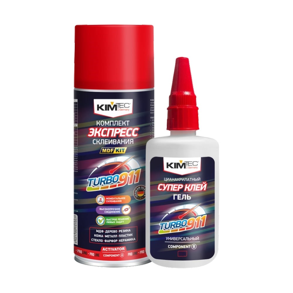 KIM TEC Клей -экспресс TURBO 911 (цианакрилатный клей 125г+активатор 400мл) 11613823 применяется для мгновенное и высокопрочное склеивание пористых и непористых материалов – дерево, кожа, пластик, каучук, металл, камень, стекло. Для ускорения полимеризации и увеличения прочности клеевого соединения рекомендуется использовать с активатором. Компонент А – активатор-аэрозоль – ускоряет процесс полимеризации, увеличивает прочность клеевого соединения. Компонент Б – высококачественный цианакрилатный клей-гель высокой вязкости. Изготовление и срочный ремонт мебели, кухонных гарнитуров, фурнитуры и комплектующих, различных предметов интерьера Быстрое склеивание и надежное соединение любых древесных материалов и производных: массива дерева, МДФ, ДСП, ОСВ, фанеры Использование в быту и в столярных мастерских Ремонт обуви, изделий или обивки из кожи, резины Склеивание фарфора, керамики, камня, стекла и металла Ремонт электро- и бытовой техники, склеивание полок, пультов, шкатулок, световых коробов, термокорпусов Использование в мебельном производстве и автомобильной промышленности Склеивание AБС-пластика, алюминия, нержавеющей стали, стекловолокна, поликарбоната, углеродистой стали, нейлона и полиуретана Изготовление баннеров, световых вывесок, дисплеев и других видов наружной рекламы, где необходимо прочное и мгновенное склеивание пластика и других материалов Ремонт ПВХ лодок и других резиновых аналогичных изделий