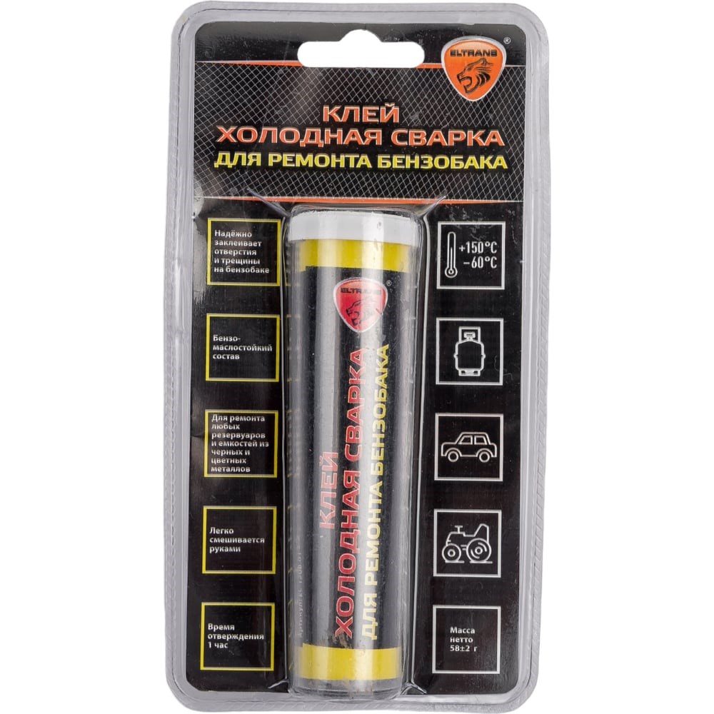 Клей - холодная сварка для ремонта бензобака ELTRANS пластиковый патрон в блистере EL-1208.01 предназначен для заклеивания отверстий и затирки трещин в любых емкостях, не контактирующих с огнем и эксплуатирующихся при температурах от -30ºС до +90ºС. Двухкомпонентный состав подходит для поверхностей из пластика (кроме полиэтилена и полипропилена), черных и цветных металлов. Продукт используют для ремонта бензобаков легковой, грузовой, сельскохозяйственной и специальной техники. Клей обладает устойчивостью к воздействию воды, масла и бензина.